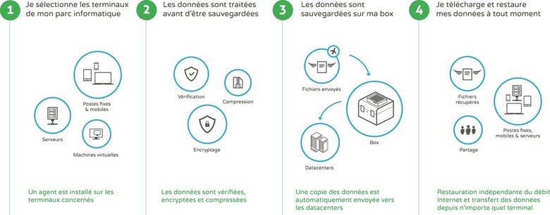 - En cas de sinistre informatique, les dossiers peuvent être restaurés depuis la box de sauvegarde en local, ce qui présente les avantages de la rapidité (Indépendance au débit internet) et de la sécurité (restauration possible même si la connexion Internet est interrompue).
